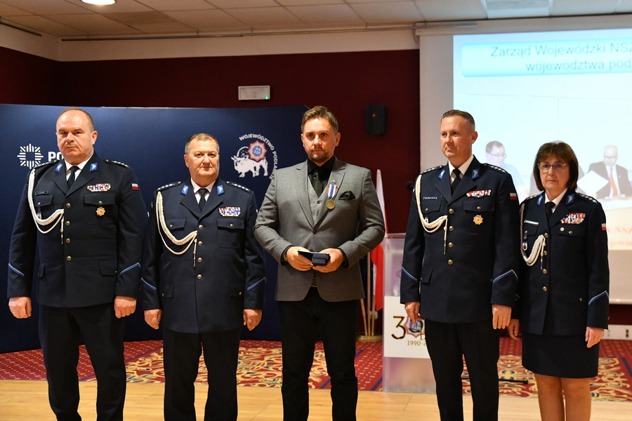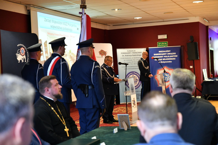z okazji obchodów Święta Policji w Komendzie Powiatowej Policji w Augustowie, upamiętniająca 106. rocznicę powstania Policji Państwowej, 35-lecie wejścia w życie Ustawy o Policji oraz 100. rocznicę powołania Policji Kobiecej. W uroczystych obchodach udział wzięli: członek zarządu Województwa Podlaskiego Bogdan Dyjuk, Starosta Augustowski Piotr Rusiecki, Burmistrz Miasta Augustów Mirosław Karolczuk, szefowie służb mundurowych, kapelan augustowskich policjantów, a także przedstawiciele instytucji współpracujących z augustowską komendą oraz policjanci i pracownicy Policji. Nie zabrakło również reprezentanta związków zawodowych oraz przedstawicieli Koła Emerytów i Rencistów Policyjnych w Augustowie.
